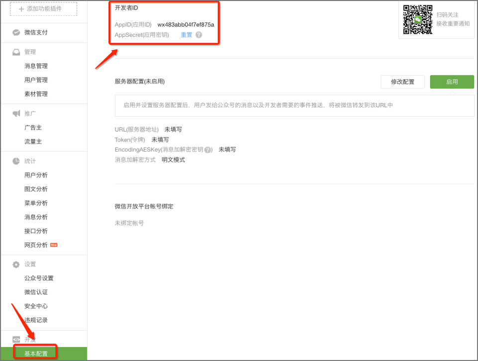 第一步,点击“基本配置->开发者ID->AppSecret(应用密钥)”。