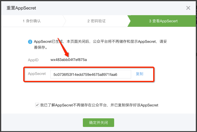 第二步,点击“重置”,按照页面提示进行操作,完成后复制AppSecret。