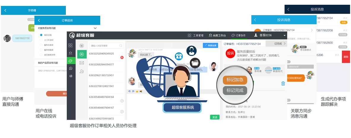 由品牌客服在超级客服系统中,协同网点、师傅、用户四方沟通,形成待办事项,跟踪事情解决进度